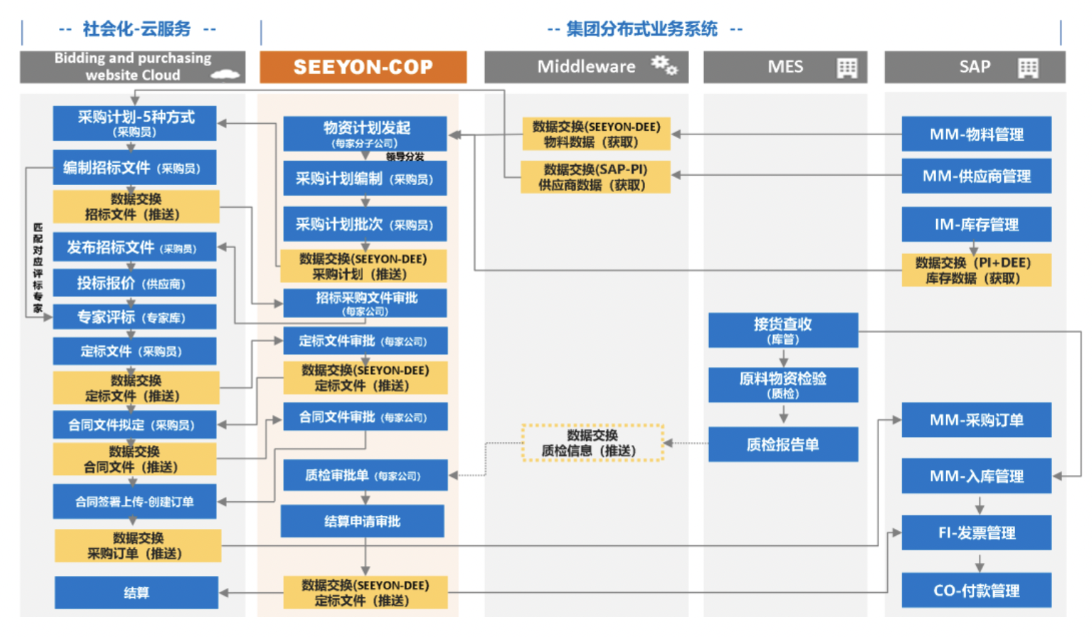 從集團內(nèi)部請購發(fā)起到外部社會化招采、合同、質(zhì)檢、結(jié)算,通過COP數(shù)據(jù)流程集成完成了多業(yè)務(wù)系統(tǒng)工作流程整合,實現(xiàn)了業(yè)務(wù)全覆蓋的采購管理閉環(huán)。